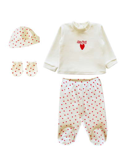 *Kit Naissance, en velours rasé, composé d’un T-shirt manches longues blanc cassé, d'un pantalon à chaussettes imprimé coeurs, d’un bonnet et d’une paire de moufles. Ultra confortable et chaud, idéal pour les premiers jours de bébé, présenté dans une jolie boîte cadeau Junior.