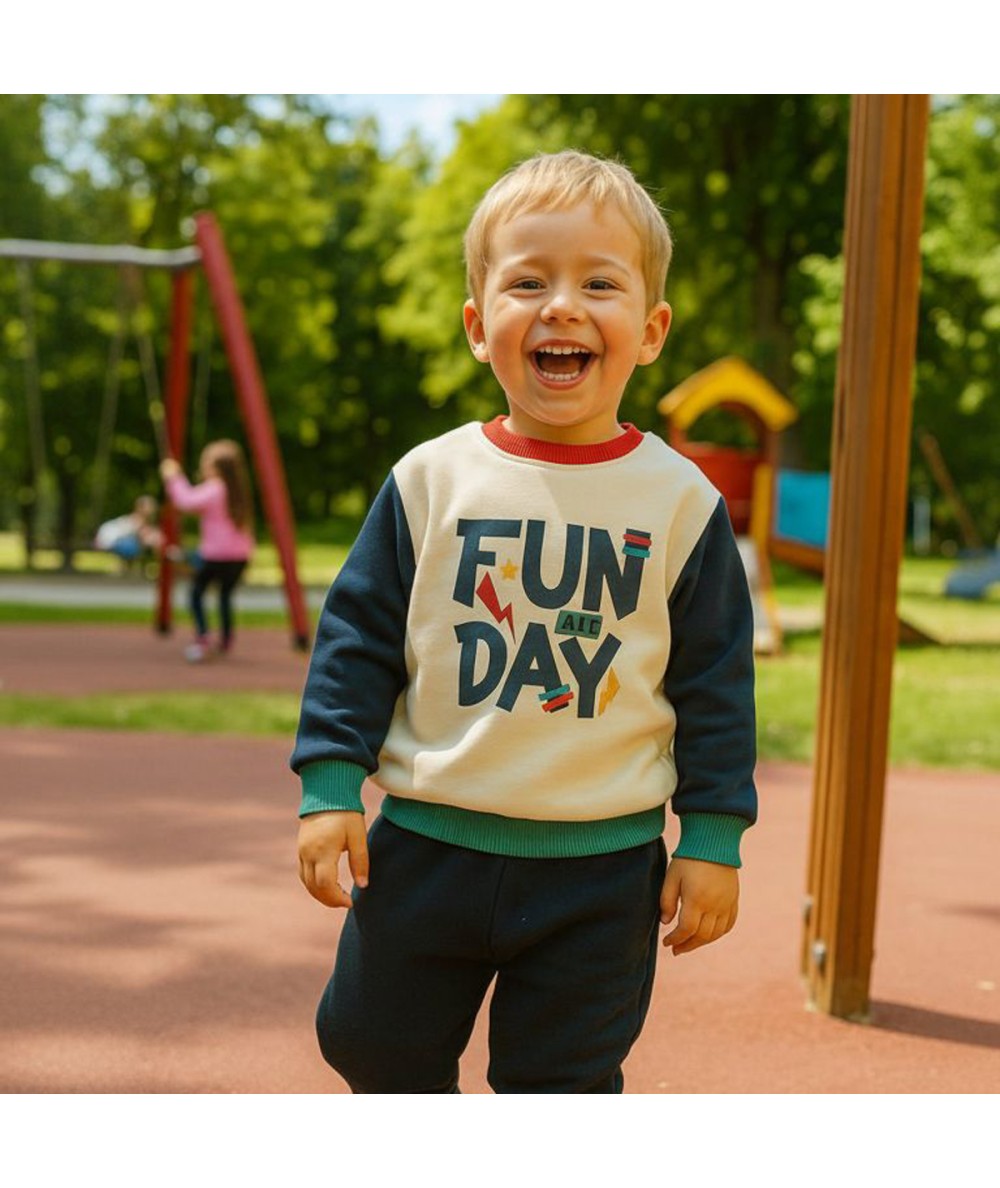 Sweatshirt col rond en molleton gratté vanille, rehaussé de manches contrastées en marine. Doux, chaud et confortable, il allie style et praticité pour accompagner les bébés et les enfants au quotidien.