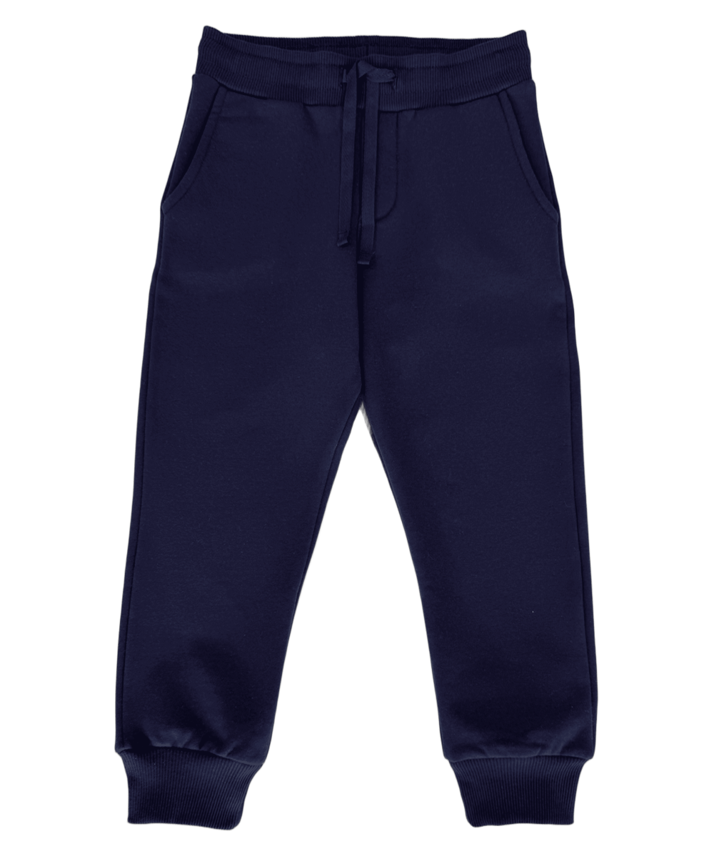 Pantalon, pour enfants, en molleton gratté coloris marine, confortable et souple, avec ceinture élastiquée et cordon ajustable pour un maintien parfait tout au long de la journée.