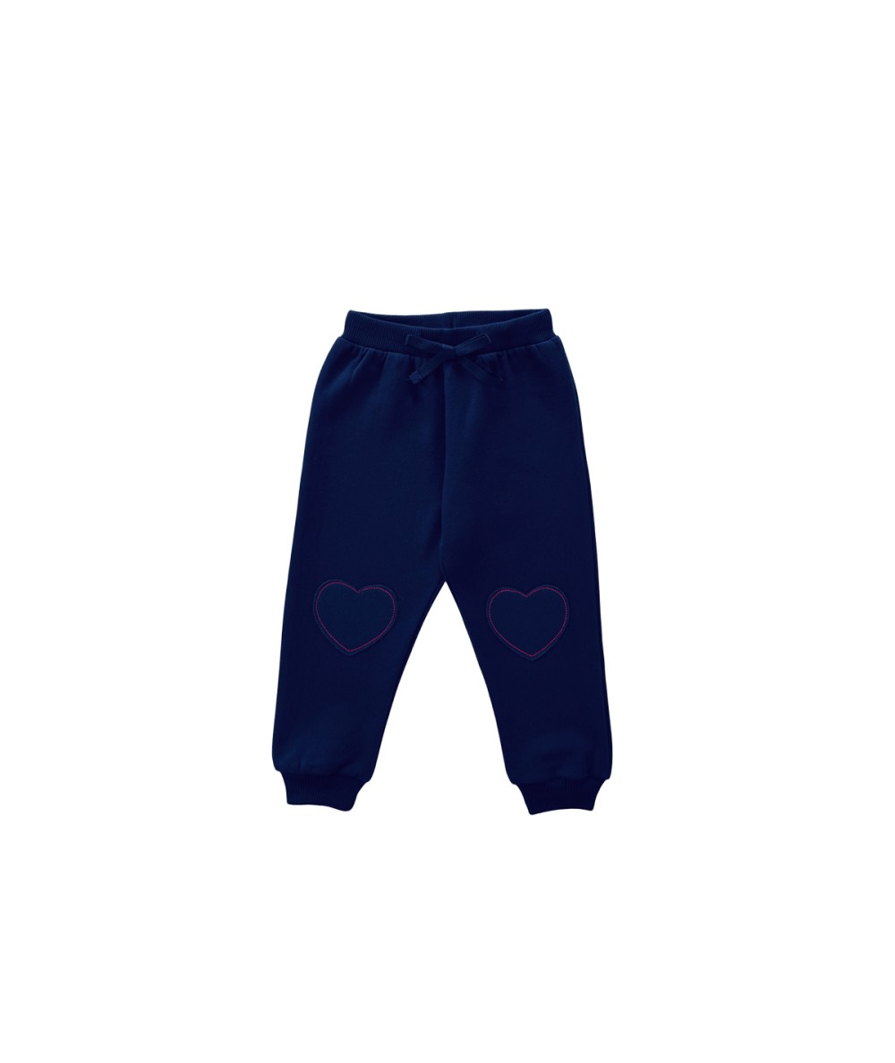 Pantalon en molleton gratté coloris marine, avec deux appliques brodées en forme de cœur pour bébés et enfants. Confortable et souple, il est équipé d’une ceinture élastiquée avec cordon ajustable pour un maintien optimal tout au long de la journée.