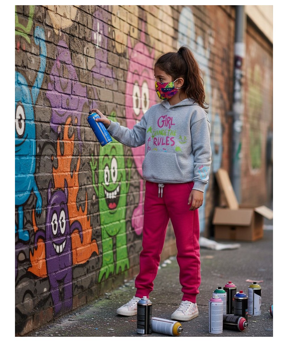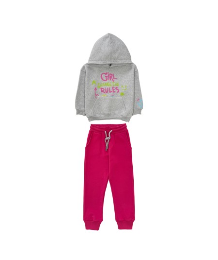 Ensemble composé d’un sweat à capuche en molleton gratté gris chiné avec poche et décorations sur le devant, le dos et les manches, et d’un pantalon en molleton non gratté coloris fuchsia, doux et confortable, cet ensemble offre style et aisance aux enfants au quotidien.