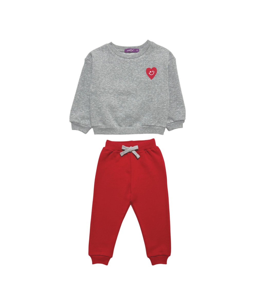 Ensemble composé d’un sweatshirt col rond en molleton gris chiné avec décorations sur le devant et le dos, accompagné d’un pantalon en molleton gratté rouge. Confortable et pratique, parfait pour le quotidien des bébés et des enfants.