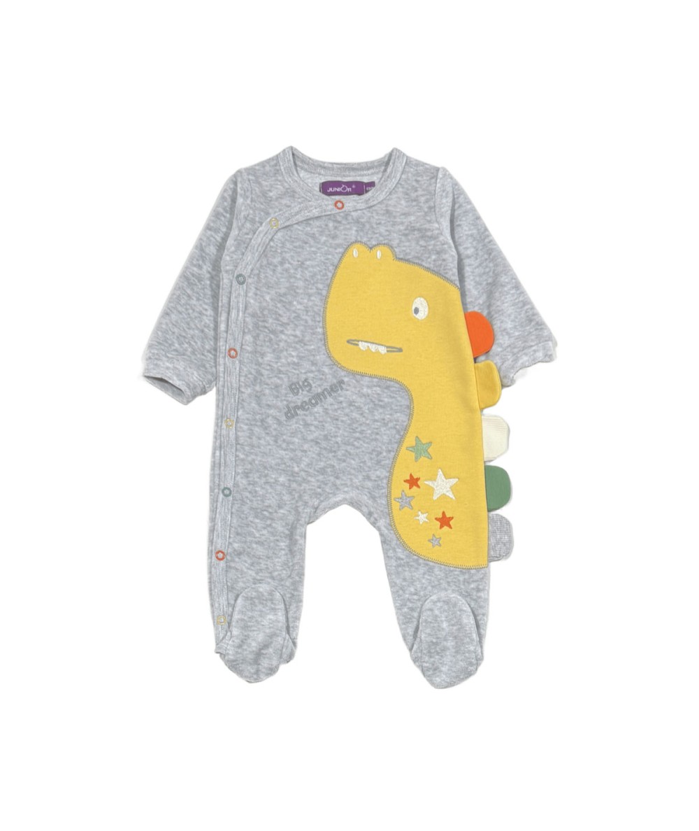 Dors-bien uni pour bébé en velours rasé gris chiné, avec une broderie appliquée dinosaure tout mignon avec ses détails colorés. Doux et chaud, idéal pour le confort de bébé jour et nuit.