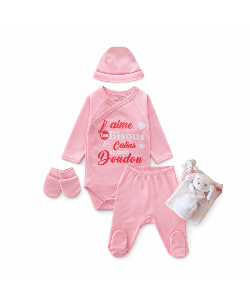 Coffret de naissance composé de 4 articles disposés dans leur jolie bourse :un body croisé manches longues et un pantalon avec chaussettes en 100% Coton , accompagnés d'un bonnet et d'une paire de moufles en 100% Coton. Le nécessaire pour les premiers jours de bébé.