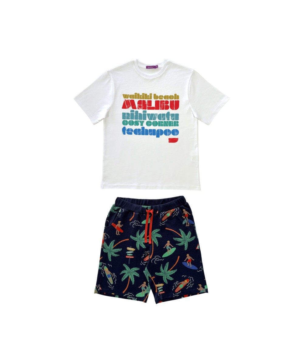 Short pour garçon imprimé avec deux grandes poches apparentes en haut, sur les côtés. Taille : ceinture élastiquée avec cordon de serrage pour un ajustement parfait. Tissu : 100 % coton certifié OEKO-TEX® STANDARD 100.
