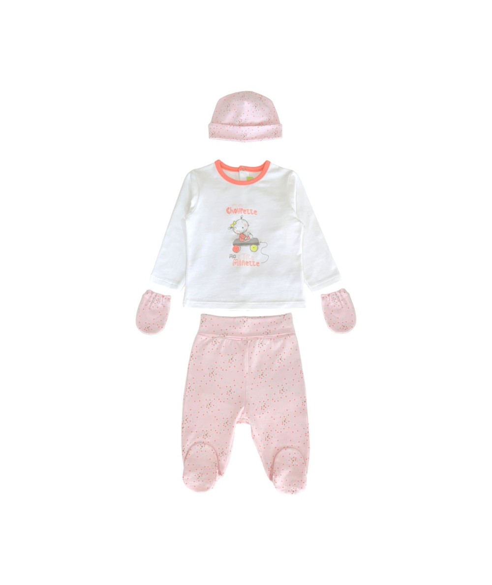 Kit Naissance, en coton/élasthanne, composé d’un T-shirt manches longues, d'un pantalon à chaussettes, d’un bonnet et d’une paire de moufles. Ultra confortable, idéale pour les premiers jours de bébé.